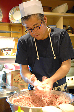 ジューっという音とともにイイ香りが漂ってきました。これは・・・、メバチマグロのカマの部分を焼いています。 そして餃子。マグロ専門店で餃子? これは、キャベツ、ニラ、生姜に挽肉ではなくマグロで餡を作っているんです。 皮はモチモチ、さっぱりしていて美味しいんだとか。 |