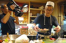 続いて箸上げのシーン。「美味しそう〜、全部マグロだわぁ」と言いながら刺身の箸上げをする増田ナビゲーター。 そうしてディスプレイ撮影の後は、いよいよ女将さんの出番です。 「練習通りに話せるかしら・・・?」と、不安そうでしたが、増田ナビゲーターが女将さんにのせられちゃうほどノリノリ!NGはたったの2回! 何度も練習した甲斐がありました。 夜の営業開始1時間前に全てのロケは終わりました。 |